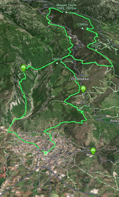 Εκκίνηση και τερματισμός της διαδρομής είναι η πλατεία 25ης Μαρτίου (κάτω πλατεία) στην Αμφίκλεια και σε υψόμετρο (ΥΨ) 400 μέτρων.